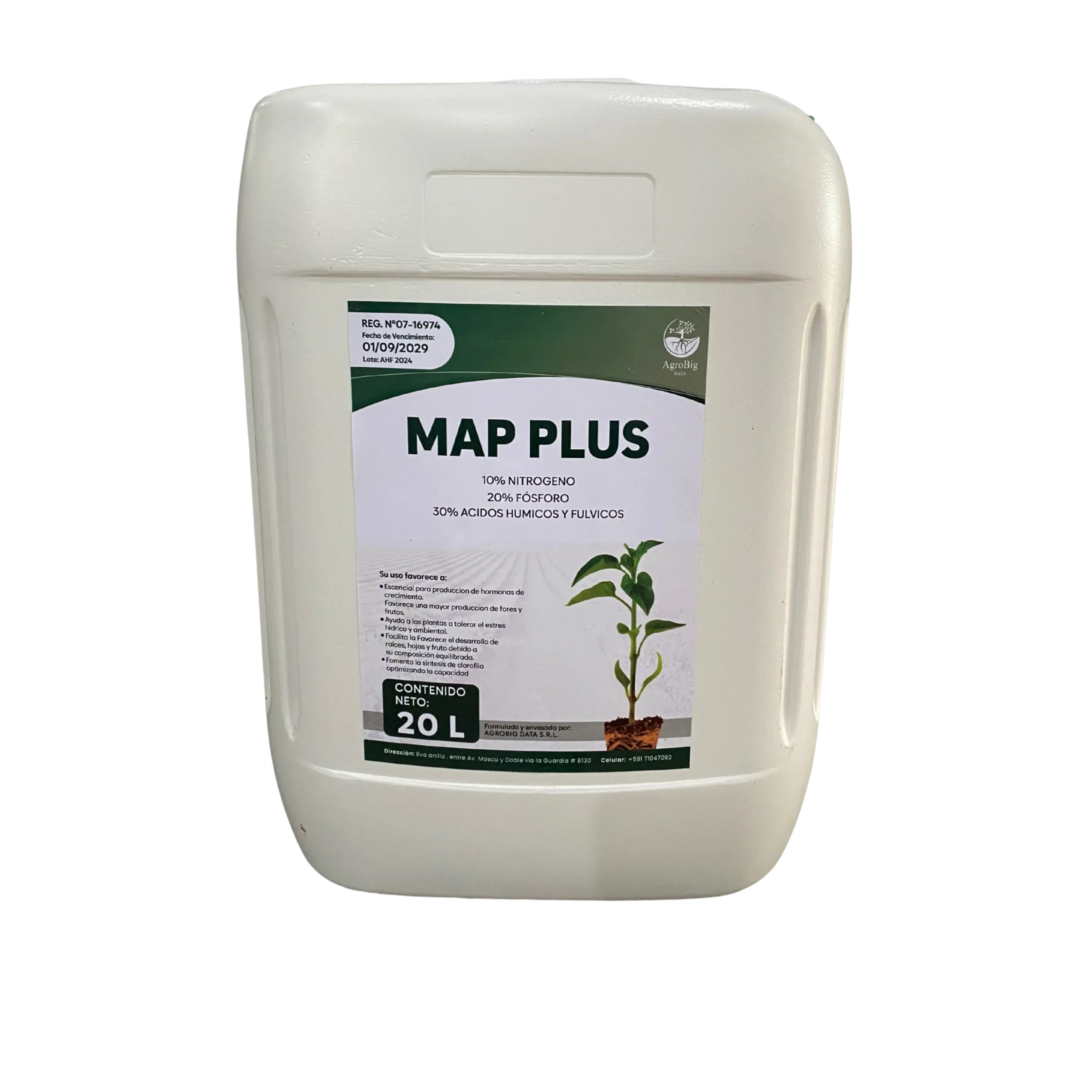 Con 10% Nitrógeno, 20% Fósforo y 30% de Ácidos Húmicos y Fúlvicos, MAP PLUS ofrece un balance perfecto para cada etapa del desarrollo de tus plantas.