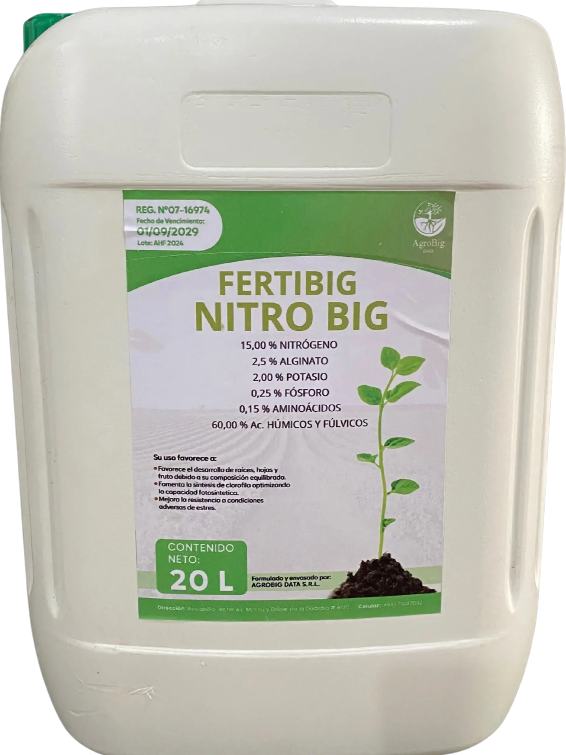 Dale a tus cultivos la fuerza que necesitan con FERTIBIG NITRO BIG, una fórmula de nitrógeno de rápida absorción diseñada para activar de forma inmediata el crecimiento vegetativo.